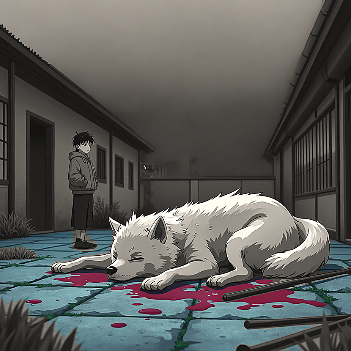 With a ferocity born from pure grief, Shiro attacked Kuri’s mother. His teeth sank into her throat as she screamed, her cries fading into silence. In that moment, Shiro avenged Kuri’s death, but he knew it was not without consequence. He had taken a life—he would pay the price.